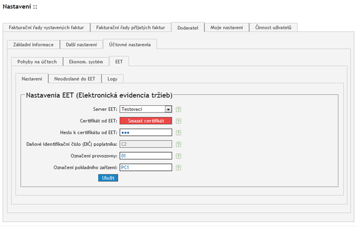 - Certifikát EET - nahráte certifikát získaný z aplikácie EET. Certifikát má koncovku .p12