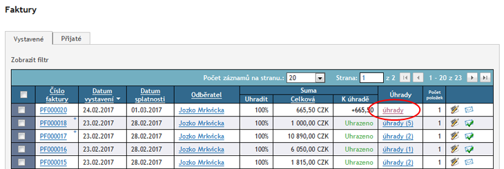 Tržbu môžete odoslať do EET, tak že pri vystavenej faktúre kliknete na "úhrady".