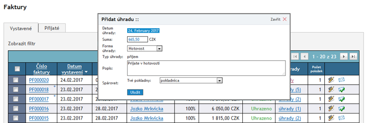 Po kliknutí na "úhrady" si pridáte úhradu. Aby bola úhrada evidovaná v EET, tak je potrebné zvoliť spôsob platby "hotovosť" alebo "platobná karta".