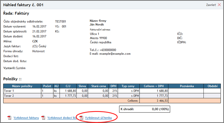 Vystavenú účtenku zašlete zákazníkovi pomocou ikony obálky, prípadne si ju môžete vytlačiť v detaile faktúry.