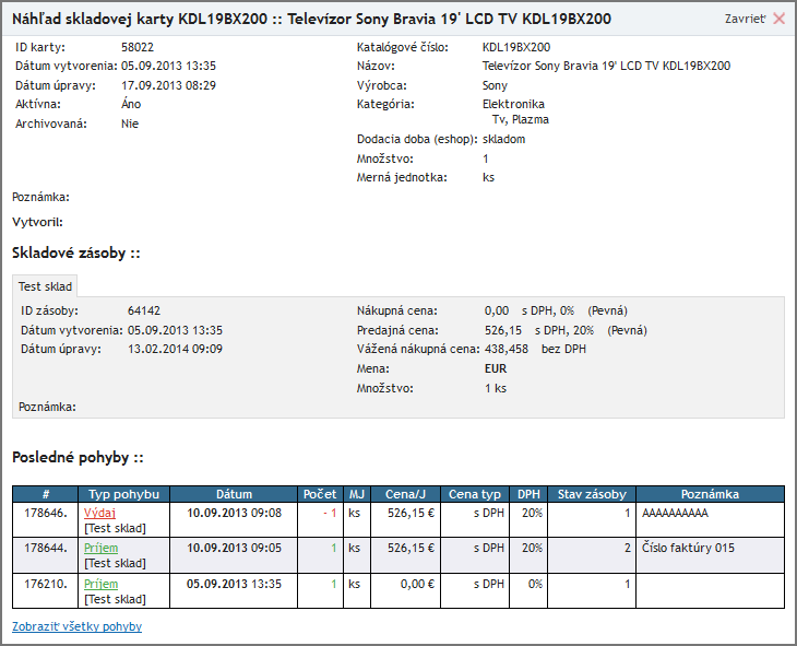 Pridanú skladovú kartu môžeme vidieť v „Zoznam skladových kariet“. To, že sme vytvorili skladovú kartu neznamená, že je už tovar zaradený v niektorom zo skladov. Je potrebné túto skladovú kartu zaradiť do niektorého zo skladov.