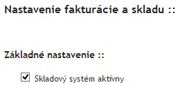 Po aktivovaní skladového systému je potrebné zaškrtnúť „Skladový systém aktívny“ v administrácii v časti „Eshop“ -> „Objednávky“ -> „Nastavenie fakturácie a skladu“.
