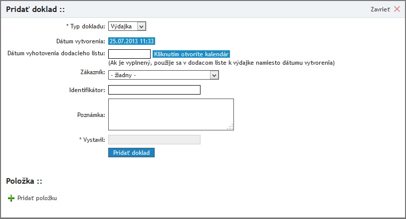 c. Pridať skladový doklad (príjemka / výdajka) – skladové doklady vznikajú pohybom tovaru na sklade.