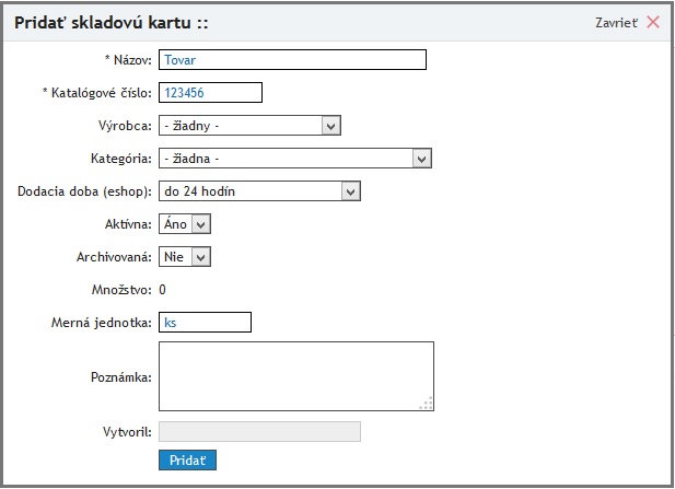 - Povinnými údajmi pri vytváraní skladovej karty sú názov a katalógové číslo tovaru.