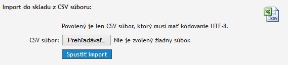 b. Po zvolení skladu, na záložke „Informácie o sklade“ sa nachádza možnosť „Import do skladu z CSV súboru“. K dispozícii je na stiahnutie ukážkový CSV súbor. Ak takýmto súborom disponujete, jednoducho ho nahráte cez formulár.
