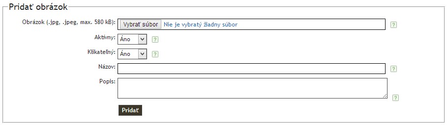 Klikneme na galériu, do ktorej chceme obrázok pridať. Zobrazí sa editor pridávania obrázkov. Nahráme obrázok, zvolíme mu aktívnosť, klikateľnosť, napíšeme názov a popis a pre pridanie stlačíme tlačidlo „Pridať“. Po pridaní obrázku sa zobrazí náhľad galérie. Pre pridanie ďalších obrázkov klikneme v náhľade obrázkov na tlačidlo „Pridať obrázok“. V náhľade galérie je možné meniť poradie obrázkov pomocou šípok ![]()